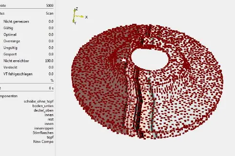 Für den Modaltest einer Bremsscheibe wurde ihr FE-Schalenmodell mit ca. 150.000 Knoten in die Software der Laser-Scanning-Vibrometer importiert (Bild 1). Vier markante Punkte des Netzes dienten zum Einlernen der Position des Messobjektes. Dazu wurde der Schnittpunkt der Laserstrahlen nacheinander auf diese markanten Positionen gebracht, die entsprechende Position des Roboterarms gespeichert und diesen Positionen die entsprechenden Koordinaten aus dem FE-Netz zugewiesen.