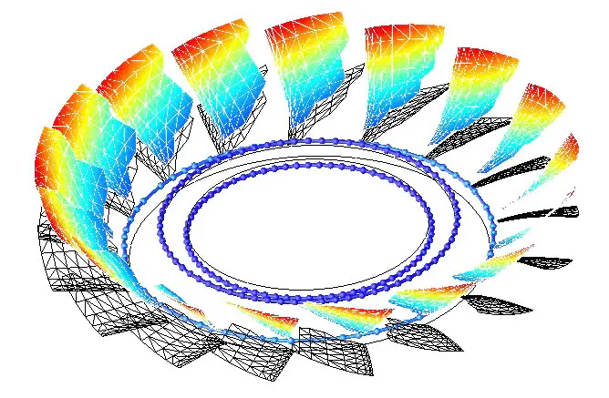 Table 1 shows the frequencies from test and simulation, their differences and the damping ratio, obtained from the test. Data is shown for the first mode family, where all individual blades show the same first-bending-type deflection shape. The frequencies are in excellent agreement, indicating that the mistuning is small. Nevertheless, the slight split in the frequencies of the double modes (0.6 - 3 Hz, for center frequencies of about 1 - 2 kHz) shows that it is present.
