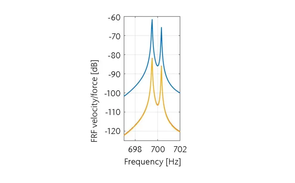 Figure 4: FRF spectrum showing a slight frequency shift between two symmetric modes