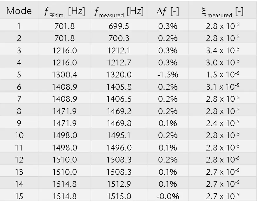 Table 1: Mode frequencies from Test and FE as well as damping values from experimental modal analysis