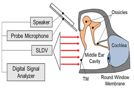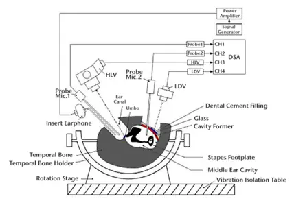The Hough Ear Institute is one of the first institutes to use Polytec laser Doppler vibrometer (LDV) for research in human ears or temporal bones. I led the research team at the institute to setup the experiment with LDV in human temporal bones to test the DDHS by measuring vibrations of the eardrum or tympanic membrane and middle ear ossicles (e.g., stapes footplate). The hearing device is designed to increase stapes footplate movement using coupled electromagnetic drive was characterized. Laser vibrometry has played a critical role for completing the measurements on DDHS function.