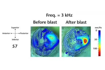 Example tympanic membrane deflection shape (3 kHz) before and after blast exposure; Gan und Jiang, J Biomech Eng, 141: 091009-1 to -11,2019