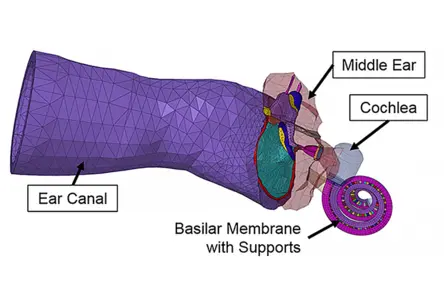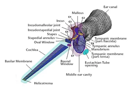 This image section shows the 3D finite element (FE) model of the human ear with the 2-chamber straight cochlea for simulation of tympanic membrane (TM) perforation and the effect tympanic membrane perforation on stapes movement. The model was validated with LDV measurements in human temporal bones (TB).