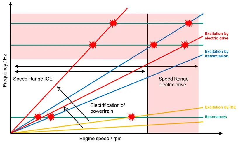 Another difference is the much higher rpm range of electric motors as compared to combustion engines. As a consequence, the excitations caused by an electric motor are in general at higher orders, resulting in higher excited frequencies (figure 2).