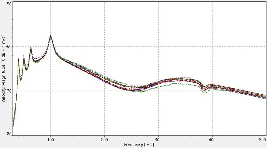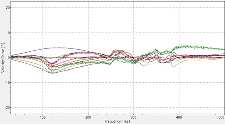 A comparison of the orthogonal vibration in the center of each membrane reveals the phase synchronicity between the different loudspeakers. Here, in addition to the magnitude responses shown, the phase responses are also shown, with one of the loudspeakers as a phase reference.