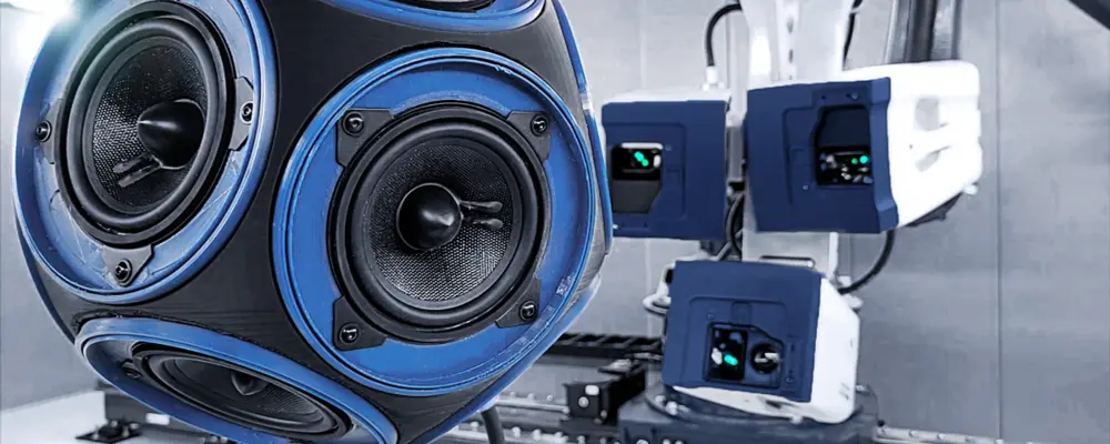 The automatic structural test station RoboVib® allows the complete characterization of the vibrational dynamics from all directions on the omnidirectional loudspeaker by the company NTEK S.R.L., with the underlying model of a dodecahedron.