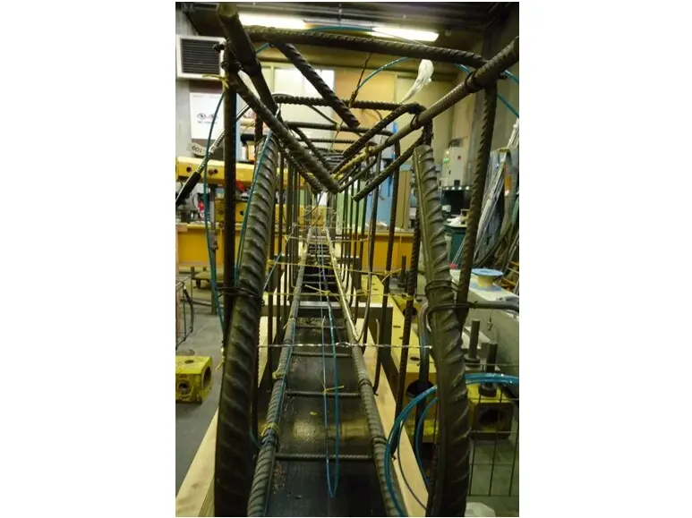 Figure 6: Reinforced concrete girder with fiber-optic cable (blue) before filling with concrete. The cable runs as a loop in the upper and lower segment to capture tensile and compression stresses