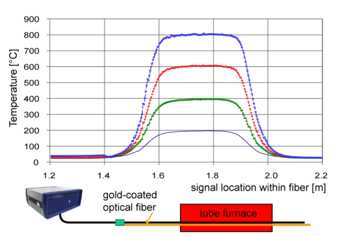 Figure 8 shows several temperature profiles which have been captured with the aid of a gold coated fiber in a tube furnace. Such commercially available fibers can be permanently operated at up to 700°C, and for short periods at even higher temperatures.