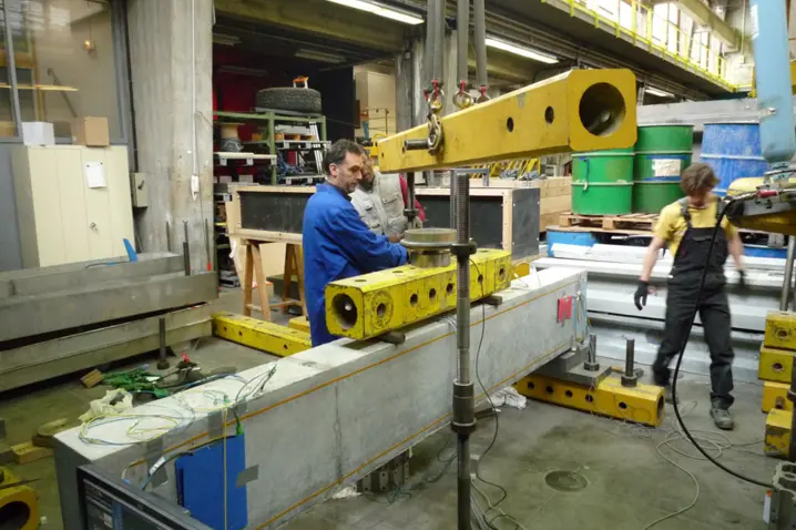 Figure 5: Load bearing test on a reinforced concrete girder which has an integrated fiber-optic cable with which to measure the strain using Rayleigh scattering