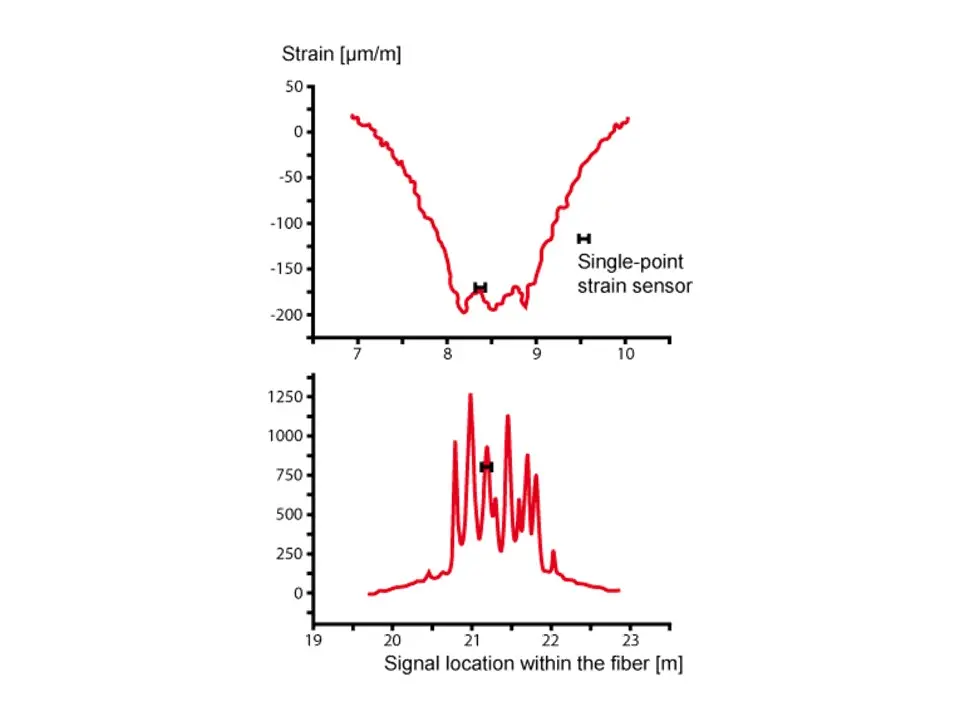 As these sensors only work at discrete measurement locations, both the number of sensors as well as their precise position are a critical feature in the design of the overall system, in particular with regard to the total cost. With this type of sensors it is a fundamental challenge to capture events if their location is not previously known, such as the development of temperature hotspots or crack formation within a concrete structure. In such cases, individual sensors positioned incorrectly can lead to completely flawed measurements and interpretations.