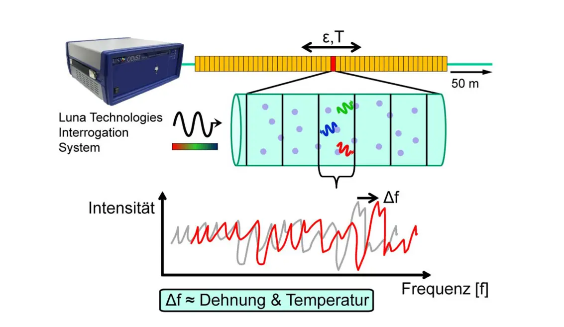 Systems which allow a quasi-continuous distributed measurement along the sensing fiber provide significant advantages. These systems use light back-scattered from the fiber material itself, which provides the required temperature and strain related information.