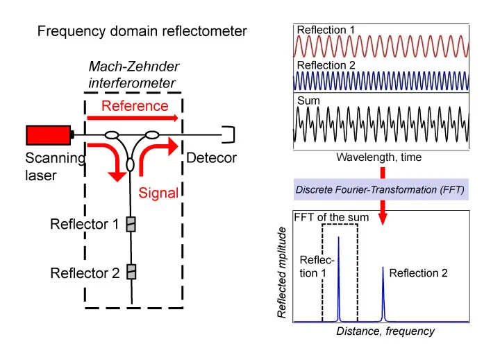 In c-OFDR systems, the beam of a variable frequency CW laser is coupled into a fiber-optic Mach-Zehnder interferometer. One fiber represents the reference arm with a fixed path length, whilst the second arm is formed by the sensing fiber. The light scattered back from the sensing fiber interferes with the light from the reference arm at the output coupler. Varying the frequency of the laser wavelength creates a periodic signal at the detector, the frequency of which depends on the location of the respective segment of the fiber scattering the light back. The further the segment is away from the detector, the greater the frequency of the interference signal. As the detector receives the backscatter signals from all the segments simultaneously, the total signal must be split into its frequency components using a Fourier transform technique. The frequencies then correspond to the signal locations in the fiber. The amplitude of each frequency component indicates the strength of the respective reflection.