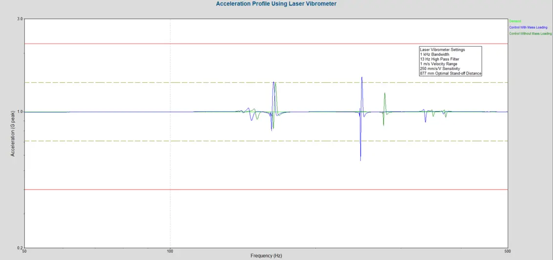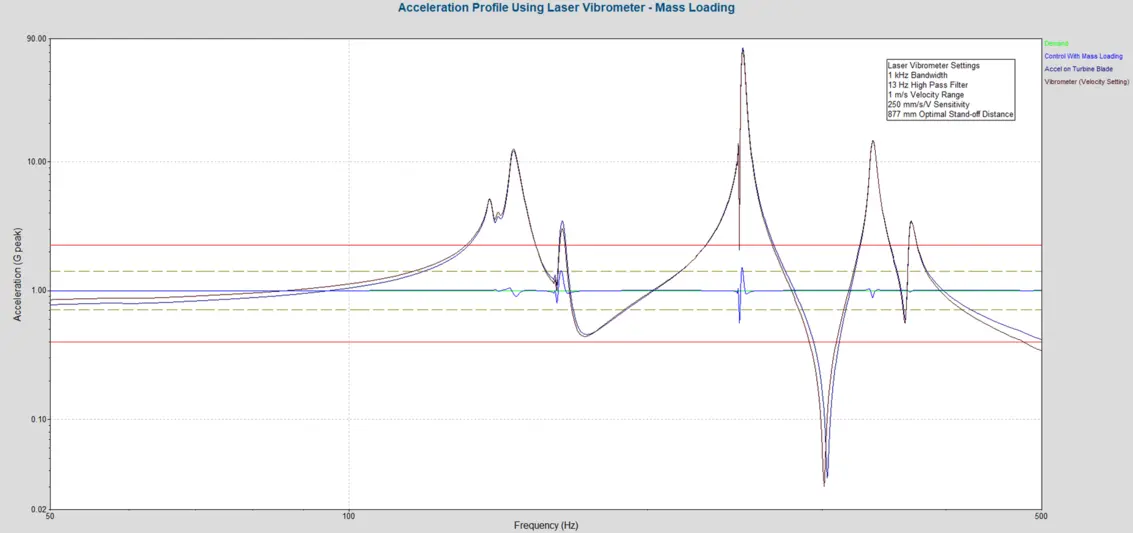 A flat 1g sine sweep from 50 Hz to 500 Hz was conducted on the turbine blade at a 1 Octave/min sweep rate. The test was conducted with and without mass loading; the „mass“ in this case being the attached accelerometer.