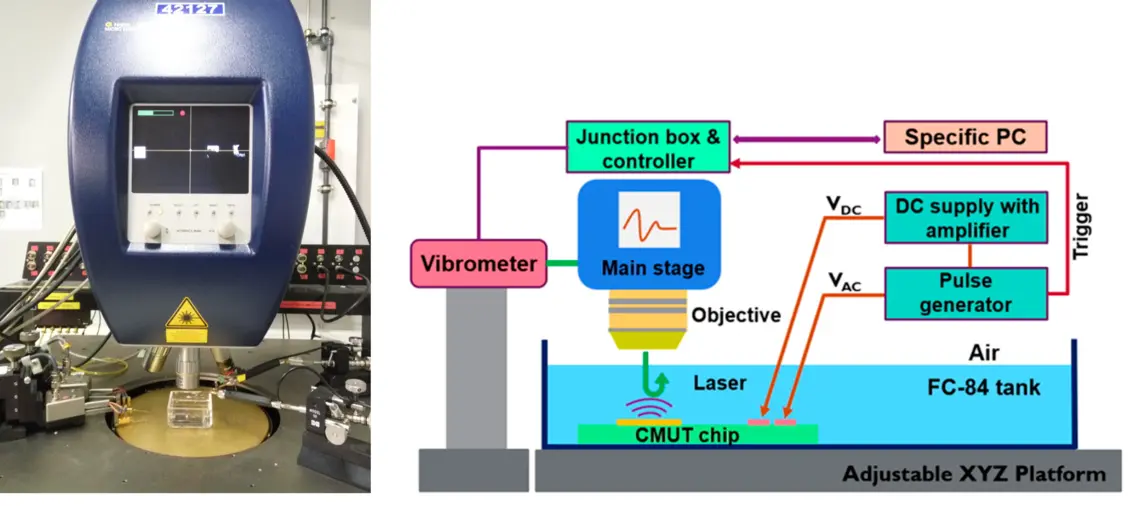 The dynamic behavior of the cMUT cell is studied using the Polytec’s MSA Micro System Analyzer Laser Doppler Vibrometer . The experimental set-up is depicted in figure 2(a). The cMUT cell is immersed in FC-84 fluid which has a depth of around 5 mm.