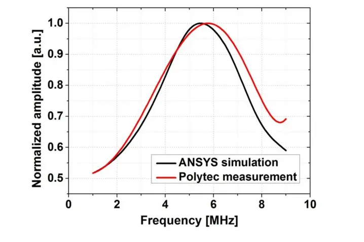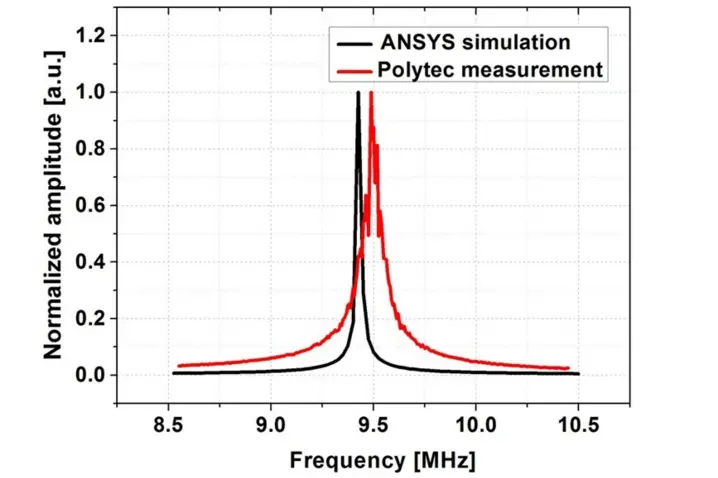 The Q-factor is characterized by the -3 dB bandwidth of the resonance response relative to its center frequency. The Q-factor 496 obtained from ANSYS simulations is about two times larger than the measured Q-factor 232. This is considered reasonable, since besides the air damping losses there are no additional losses taken into account in the simulation. Therefore, the air damping is negligibly small and the material damping and/ or the support or anchor (losses) damping are dominating.