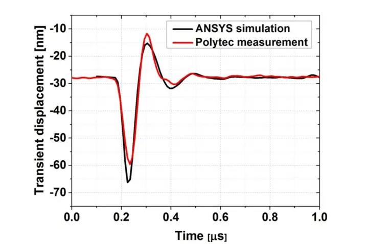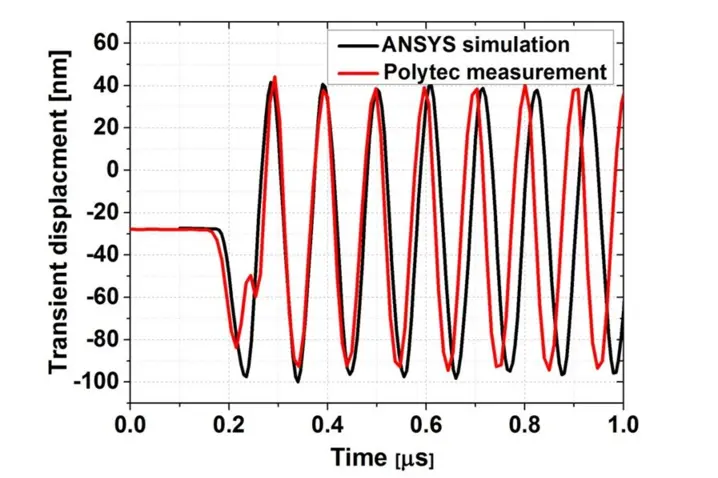 Dynamic responses of the cMUT cell in air using ANSYS simulation and Polytec measurement are shown in faigure 5. A good amplitude match is found over the first several cycles. Due to the resonance frequency and Q-factor mismatch, the difference between simulation and measurement becomes significant after several cycles. However in the measured case, because of the additional damping (material damping, anchor losses) besides the air damping, the response is expected to decay much faster than for the simulated cases.