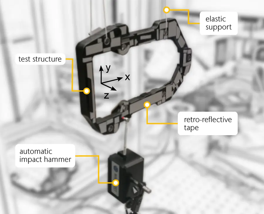 The second example presented here is intended to compare the two vibrometer measurement systems PSV QTec (multi-path) and PSV-400 (single-path). For this purpose, an experimental modal analysis (EMA) was performed on a plastic component using both systems. The experimental setup is shown in Figure 3. In addition to the coordinate system, the figure contains the free-free suspension of the system, the positioning of the automatic modal hammer (manufacturer Maul-Theet GmbH, model vImpact-60) and the preparation of the measured object with retroreflective tape.