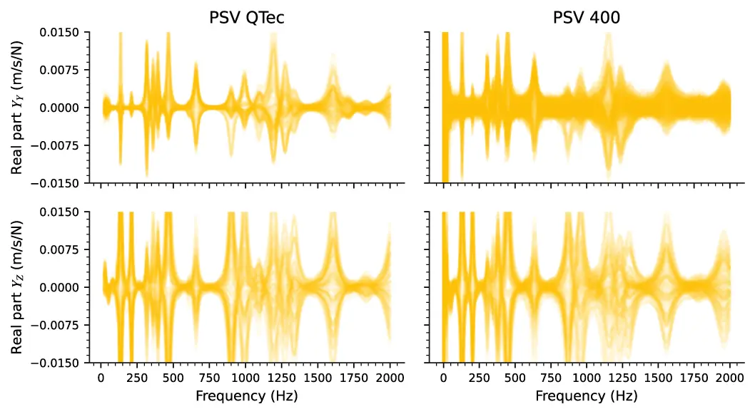Both experiments were conducted using identical scan-point grid (approx.. 120 measurement locations), measurement settings and comparable excitation source. First, the comparison of the acquired FRF is made using the real parts of the determined admittances as an example, which is shown in Figure 4. The left and the right parts show the FRF from PSV QTec and PSV-400 respectively. The two upper diagrams contain the responses in the y (inplane) direction. The lower plots show the system responses in the z (out-of-plane) . The diagrams are used for qualitative comparison of the real parts, which is why the individual responses are shown slightly transparent. Darker areas therefore indicate frequencies at which several FRF overlap.