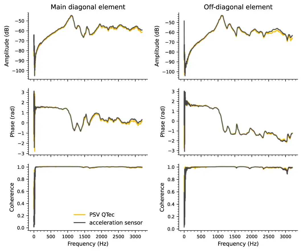 As shown in the figures, the selected admittances match very well in both amplitude and phase frequency response. The presented case-study illustrates that both methods of response acquisition lead to comparable results for both main and crosstalk components. This proves that multi-path interferometry for the acquisition of input admittances of real technical structures is possible for possible for main and off-diagonal elements.
