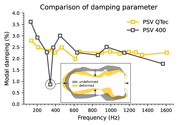 Based on the points shown in the figure, it can be observed that significantly more modes can be determined using the PSV QTec, which is especially true in the frequency range 750 – 1500 Hz. The figure also includes a representation of the fourth mode, which shows a dominant inplane component and for which clearly different damping values were determined. This is due to the higher noise floor of the PSV-400 (single-path interferometer) in the inplane direction. In summary, the comparison shows that significant advantages can be obtained with multi-path interferometry when performing an EMA.