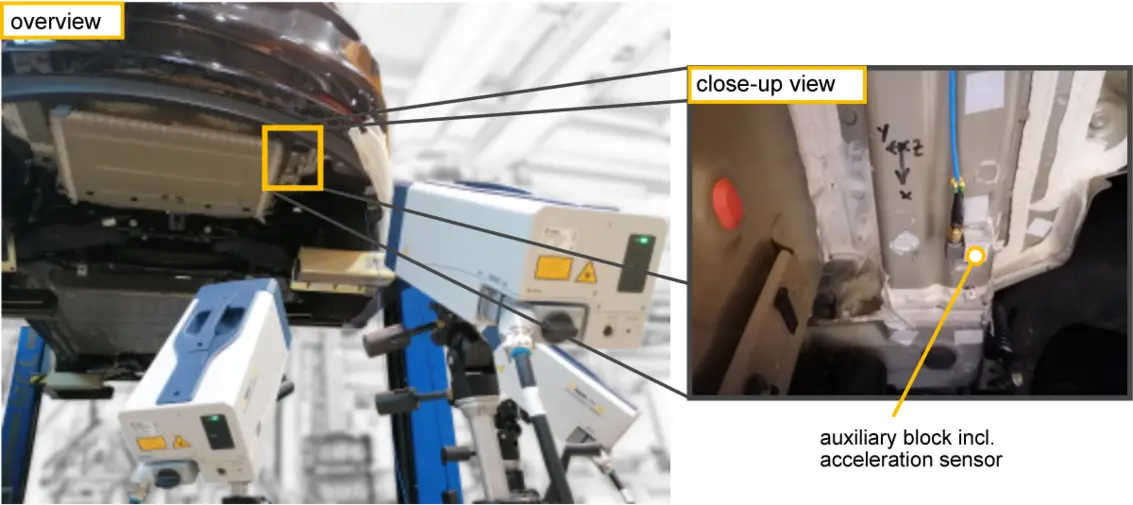 In general, a complete evaluation of the interfaces requires the consideration of all three translational and rotational degrees of freedom. In other words, crosstalk components components (perpendicular to the excitation) are as important as the main degrees of freedom (in the direction of excitation) and must be recorded in most test cases. Input admittance measurements to evaluate the suitability of QTec multi-path interferometry were performed on a vehicle side member close to the excitation position. The measurement location as well as the positioning of the scan heads are shown in figure 1.