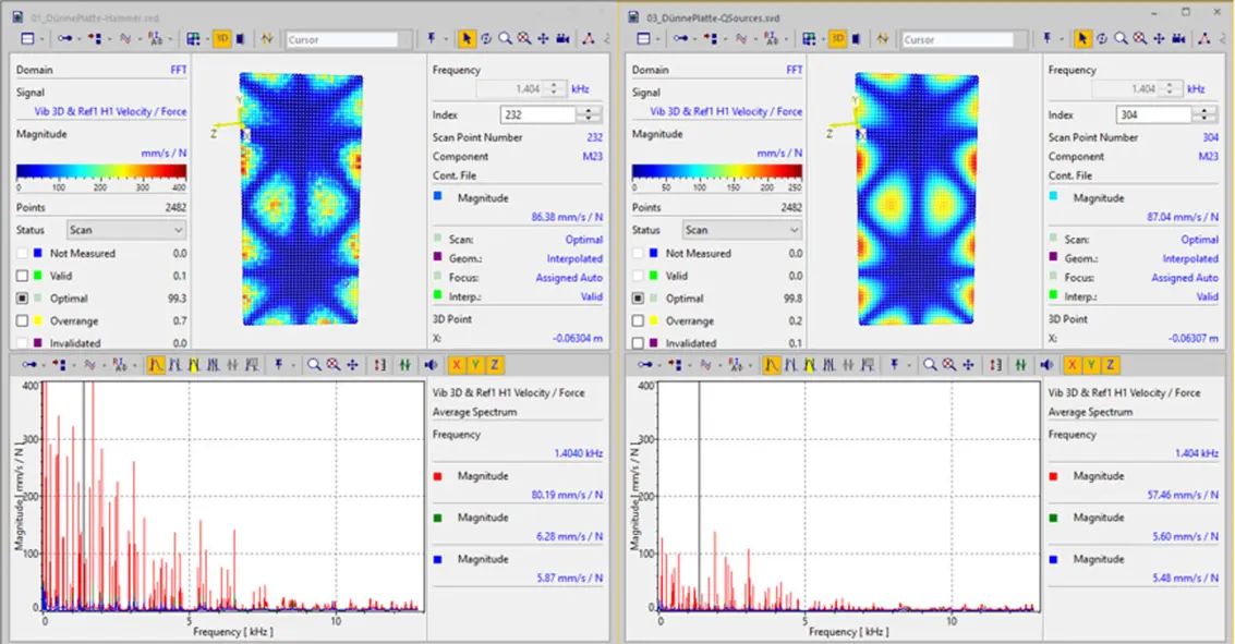 Since this additional noise can be compensated using multi-channel QTec® Scanning Vibrometers both technologies, the inertial shaker and the automated hammer produce test data on the same level. Limitations can be the lower frequency limit of the Qlws and the added mass for extremely light weight or extremely low damped samples.