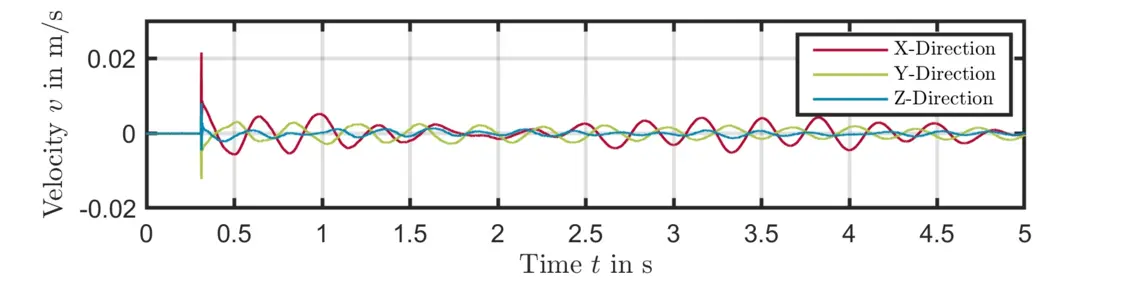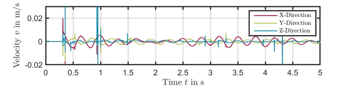 Figures 5 and 6 show the time signals of the measured surface velocity with and without QTec technology for a selected measurement point when excited with the automatic modal hammer. Due to the test setup and the necessary elastic mountings, the transverse movements of the machine lead to signal drop-outs if no QTec is used.
