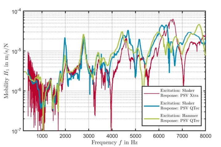 Figure 4 shows an example of the results of a transfer function to compare the test setups: excitation using a shaker or automatic modal hammer and measurement of the vibration response using the PSV Xtra or the PSV QTec.