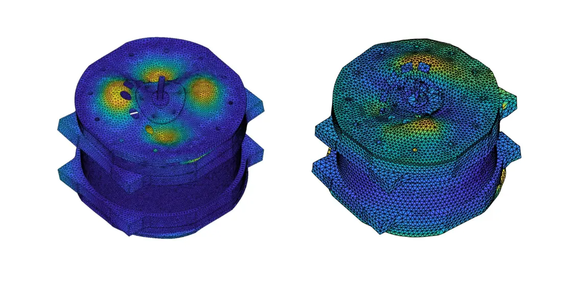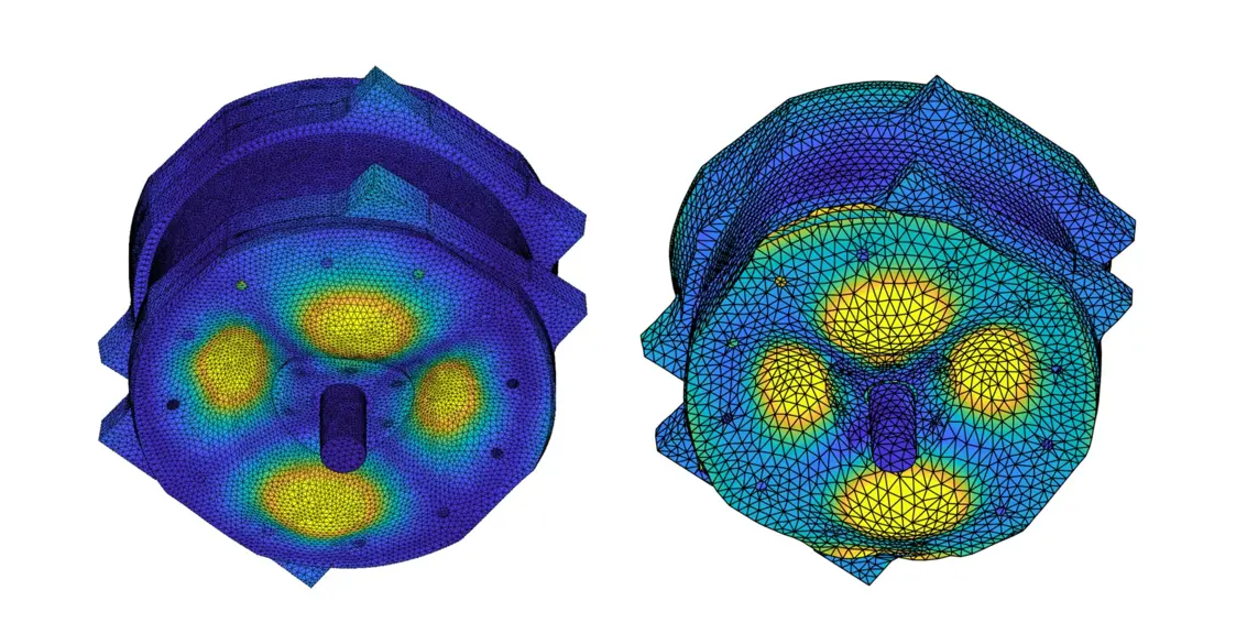 A correlation between measurement and simulation shows for a frequency, for example, that there is a high degree of agreement between the model and measurement on the front of the machine (Figure 9a). On the rear side of the machine (Figure 9b), the mode shapes do not match locally. This suggests that with current modeling methods, the influence of the wiring of the electrical machine cannot be sufficiently taken into account in this frequency range.