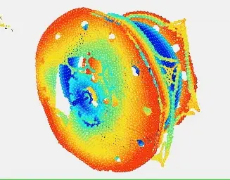 Overall, the test setup with automatic modal hammer and QTec vibrometer makes it possible to carry out an experimental modal analysis of the electrical machine up to 12 kHz. The following illustrations show exemplary deflection shapes at selected resonance frequencies of 2.8 and 4.6 kHz as well as 6.2 and 9.8 kHz.