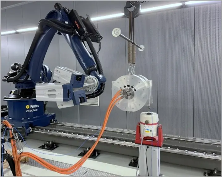 Figure 2: Setup in the RoboVib test center with PSV QTec and automatic modal hammer