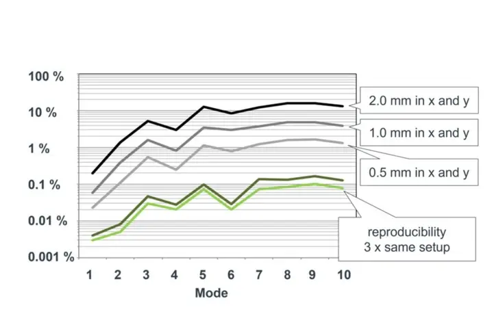 The incorrect positioning of the measurement grid on a test specimen in an order of magnitude of approx. 1% (0.5 mm @ 50 mm) results in a 0.02…1.0% change in the MAC value, depending on the mode. In other words, MAC 1 ideally changes to MAC 0.998 to 0.99, which is negligible.