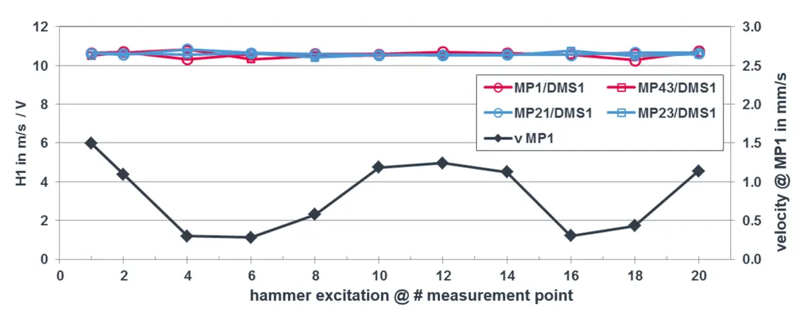 In order for the H1 PSV/strain gage transfer function to be evaluated as a characteristic, the vibrational velocity measured with the PSV laser vibrometer was used as a reference here, instead of the force.