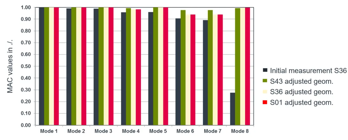 A modal test is intended to validate the simulation model. The Modal Assurance Criterion (MAC) is a proven indicator for this. By comparing the eigenmodes from the calculation and measurement, the degree of correlation for each mode can be determined. Values >0.95 must be targeted.