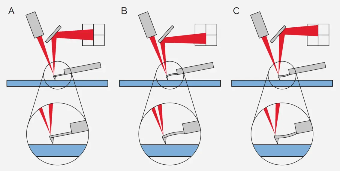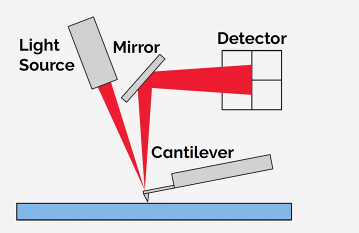 Virtually all commercial AFMs today use what is known as “optical beam detection” (OBD), sometimes called just “beam bounce” detection to sense the displacement of the tip. As shown in Figure 1, a beam of light (typically from a laser diode or superluminescent diode source) is focused on the back of the cantilever.