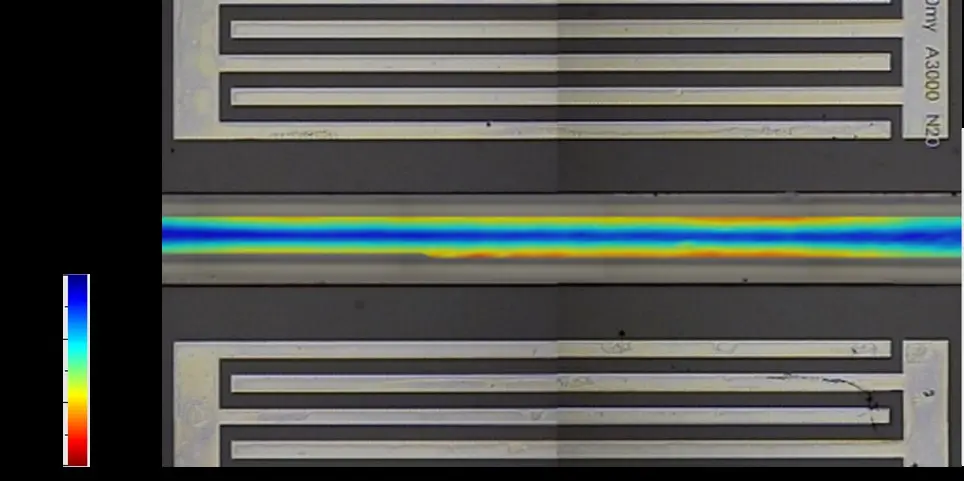 The acoustic field generated by these IDT pairs is driving a pressure gradient in the microchannel fluid by which cells can be influenced based on their intrinsic properties. First, the cells and particles are focused in the first stage and then separated from each other in the second stage due to different in size, density, shape or compressibility. The layout design was verified by measuring the SAW amplitude distribution in the open microchannel. For this purpose, a laser Doppler vibrometer (UHF 120, Polytec GmbH) was used (see Figure 2).