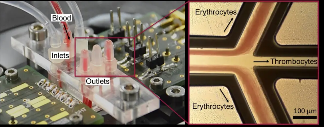 Figure 3: Acoustofluidic setup for the sorting of blood components. Magnified inset of chip shows separation stage: larger erythrocytes are deflected to side outlets and smaller thrombocytes leave through the central outlet