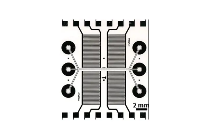Figure 1a: Acoustofluidic chip with layout for cell and particle sorting
