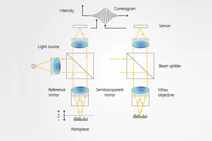 In a Coherence Scanning Interferometry optical profiler, white-light passes through a beam splitter, which directs the light to both a sample surface and to a reference mirror. When the light reflects back from these two surfaces, it is recombined, and a pattern of interference “fringes” forms. Maximum fringe contrast occurs at the best focus position for each point on the sample. Either the test sample or the measurement head is scanned/ translated vertically (Z direction) in such a way that each individual camera pixel point on the surface passes through focus. In general, a math algorithm is applied. It should be noted that the better the math, the greater the clarity of the focus can be defined. For Polytec as Coherence Scanning Interferometry specialist, they have a math algorithm called the “correlogram”. This correlogram signal processing algorithm uses the interference signals to find the best/ sharpest focus point, operating beyond the diffraction barrier of light to provide sub-nanometer Z sensitivity.