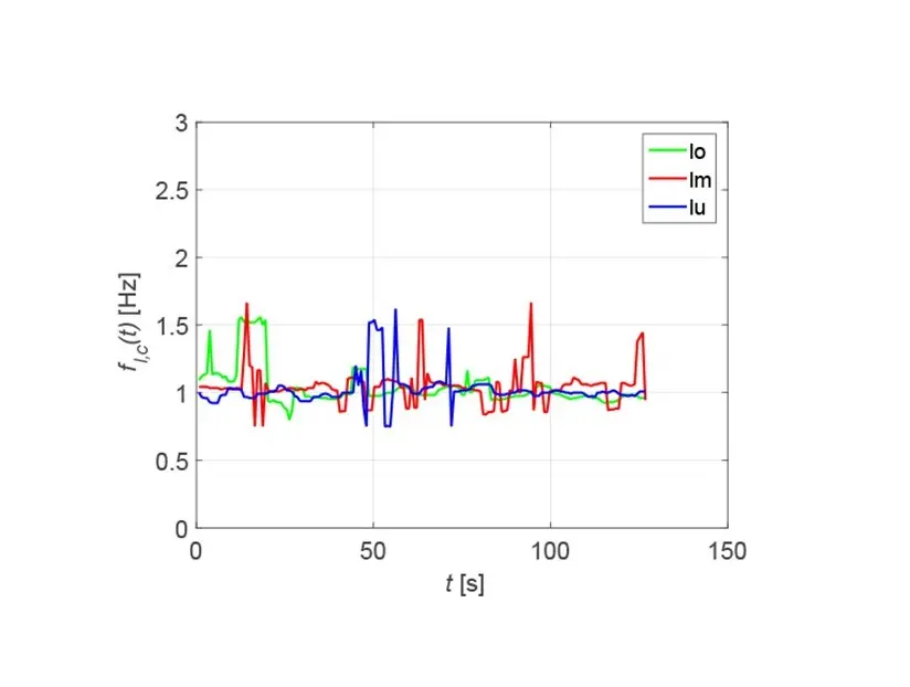 By zero-padding the resolution can be increased at the expense of the accuracy. For the correlation method, the frequency-dependent spectral resolution at a heart rate of f = 1 Hz or 60 bpm is Δf = 8.23 mHz or 0.49 bpm. Therefore, the correlation method is the preferred approach, especially since it is possible to determine the best measurement point on basis of a criterion derived from the correlation function. The heart rates determined for the measurement signals in Fig. 4 are shown in Fig. 6, where the green curves are assigned to the upper, the red curves to the middle and the blue curves to the lower measurement points.