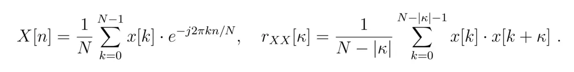 The desired heart rate is found either in the spectrum where it is represented by the maximum peak or alternatively in the correlation function as the reciprocal of the distance between the maxima. For the two measurement signals x[k] in Fig. 1, Fig. 5 shows the corresponding correlation functions. The periodicity of the measurement signals x[k] is also found in their correlation functions rXX[κ]. The spectral resolution and thus the accuracy of the determined heart rate is limited for the spectral method by the sampling frequency - here fs = 120 Hz - and the number of samples - here N = 600 - to Δf = 0.2 Hz.