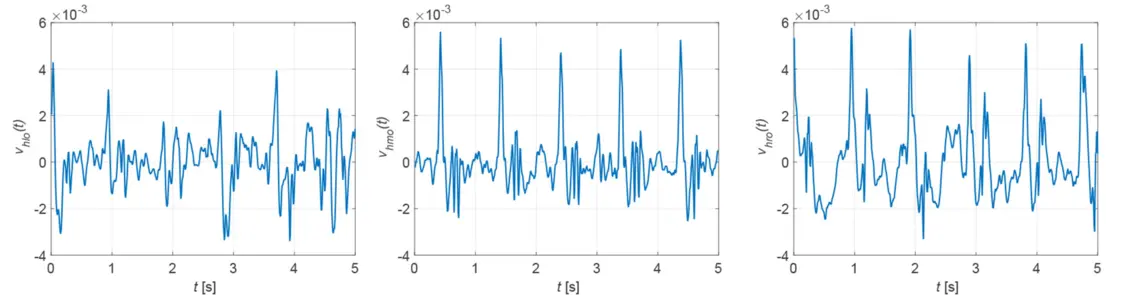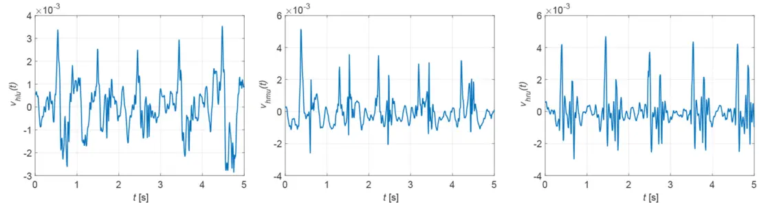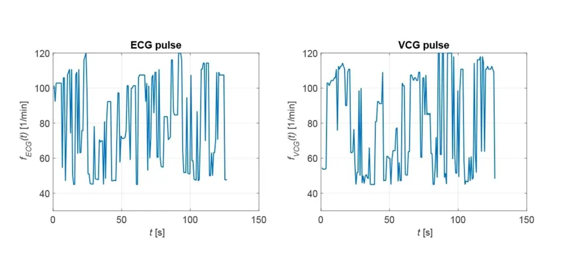 Anyone expecting the ECG measurement curve to match the curve obtained by the vibrometer, here referred to as a vibrocardiogram (VCG), will be disappointed. This is shown by the two measurement results in Figure 1. The ECG shows the usual course. Clearly visible are the upper and lower peaks of the ECG, labeled P, Q, R, S and T, which one looks for in vain in the VCG. But the spacings of the extreme peaks are identical in both measurement methods. This means, the instantaneous heart rates - here about 1.2 Hz or 72 beats per minute (bpm) – do match in both measurement data, so anomalies can indeed be detected.
