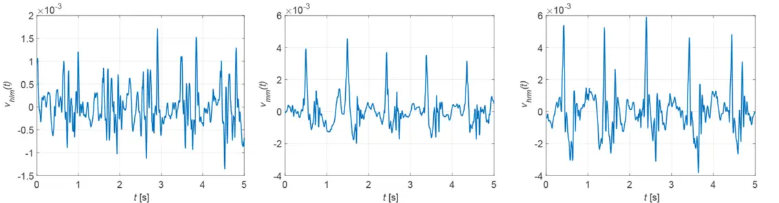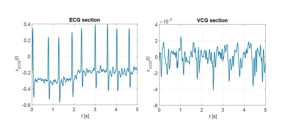 In cardiac fibrillation - more precisely the ventricular fibrillation - the heart rate deviates from its normal value and can be elevated up to f = 5 Hz or 300 bpm. This causes long-term damage to the heart, so its detection is important. The patient usually does not notice anything until damage to the heart has already occurred. Figure 7 shows sections of ECG and VCG in the presence of cardiac fibrillation.