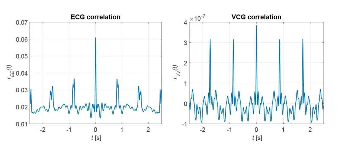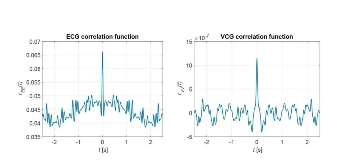 Figure 5: Correlation functions of ECG (left) and VKG (right) of the measurement signals in Figure 1.