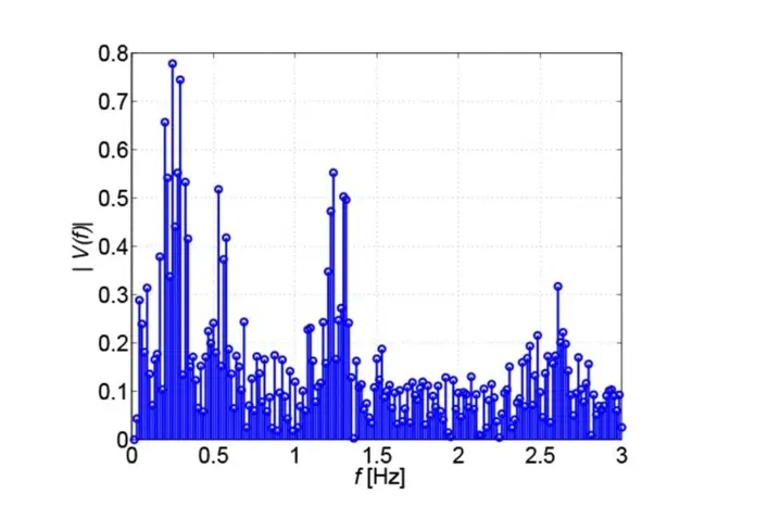 The ECG is an electrical signal, so it only records the activity of the heart. In contrast, the VCG shows the mechanical movement of the heart muscle. This can be seen in the spectrum of the VCG in Fig. 2, showing three cluster points of spectral lines: at f = 0.25 Hz, f = 1.2 Hz and f = 2.4 Hz. The middle spectral cluster corresponds to the heart rate. Since the heartbeat varies slightly with time and the measurement takes about 2 min, this results in the cluster shown. At twice the frequency is a second cluster, caused by the heartbeat not being purely sinusoidal, which results in harmonics. Finally, the cluster at f = 0.25 Hz is due to respiration, which as a mechanical signal is also detected by the vibrometer. So, in addition to cardiac activity, the vibrometer can also be used to detect respiration! The heart activity is extracted from the vibrometer signal by high-pass filtering with the cut-off frequency fg = 0.58 Hz.
