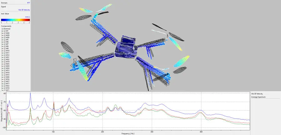 Figure 1 shows an example operational deflection shape taken on a drone body and stationary rotors at 53Hz. The movement of the structure is highlighted in color in contrast to its resting position indicated by the black hashed areas. The vibration data has been captured with a 3D scanning system. Using a robot-based system scans were taken from different sides and angles in an automated process with short measurement times. The graphs below the deflection shape are the average spectra in X, Y and Z direction of all the measurement points. As with all complex structures, there are always multiple resonance frequencies to consider.