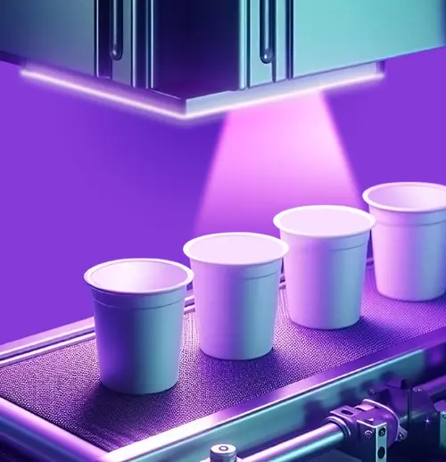 Each cup is disinfected with UV pulses. The lamp is positioned above the conveyor belt, treating 10 cups simultaneously (Figure 3). This takes only 0.5 to 1 second, easily keeping up with the high production speed.