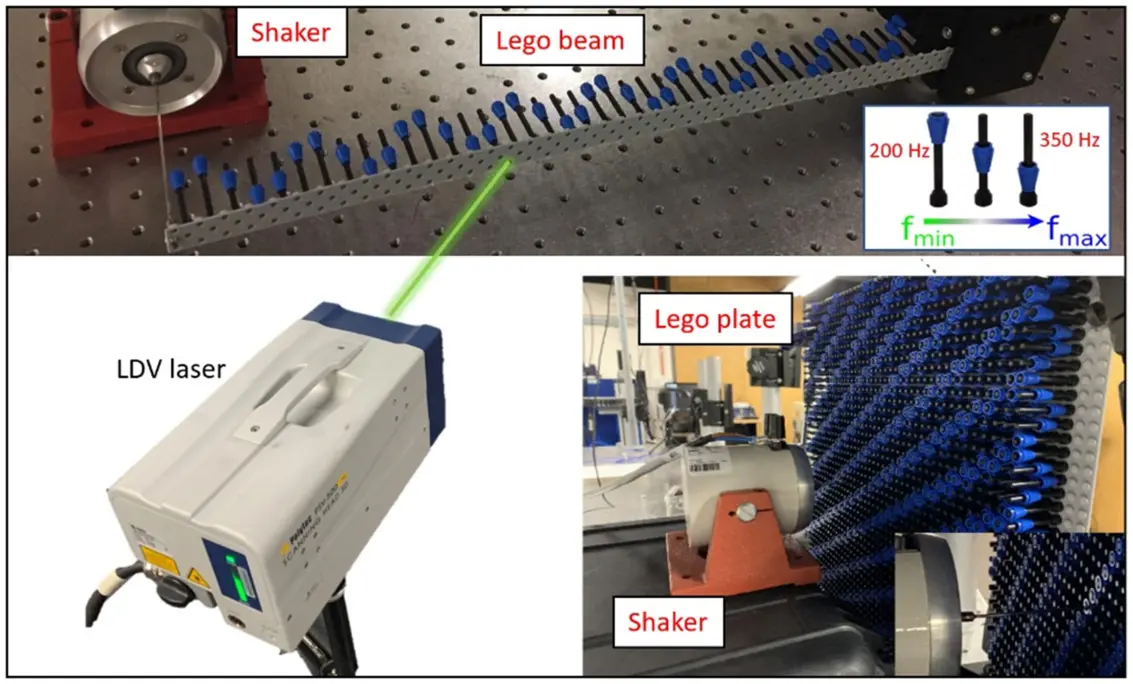 Our experiments leverage LEGO pieces as simple implementations of mechanical resonators (Fig. 1). Each resonator is composed of a pillar (black) and a cone (blue). By sliding the cone along the pillar, the resonance frequency is tuned between a minimum and a maximum value of about 200 - 350 Hz (as illustrated in Fig. 1). These resonators are attached to a base LEGO beam or plate, in quasi-periodic configurations designed to alter their wave propagation and vibration features. An electrodynamic shaker is used to induce vibrations of the samples, while a Scanning laser Doppler vibrometer (SLDV) from Polytec is used to record the frequency response along the flat surface of the samples (the side without resonators).