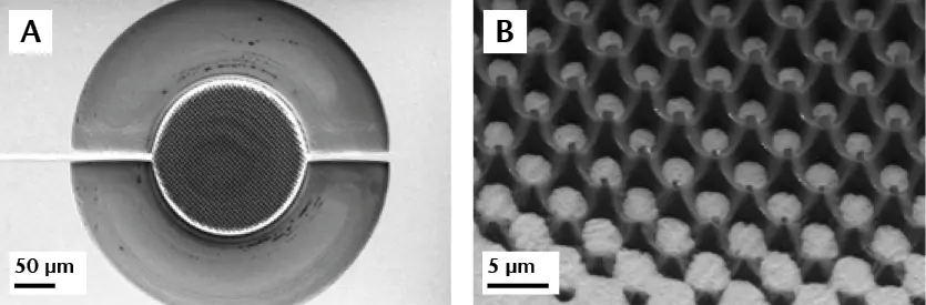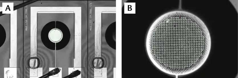 To enhance diffused scatter that is required for detection of in-plane displacement, photoresist patterns are incorporated on the top electrode of the disks. Figure 5a shows the disk resonator that was tested, whereas figure 5b shows a closeup with the surface modification to increase backscattered light.