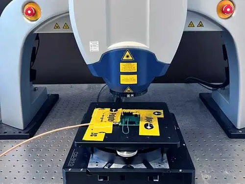 Microfabricated disk resonators are fixed to a fan-out PCB with electrical connections through wire bonds to connect to Polytec MSA-100-3D. This vibrometer provides vibration information in both inplane and out-of-plane directions. Electrically excited modes are scanned, and mode shapes are analyzed using PSV software.